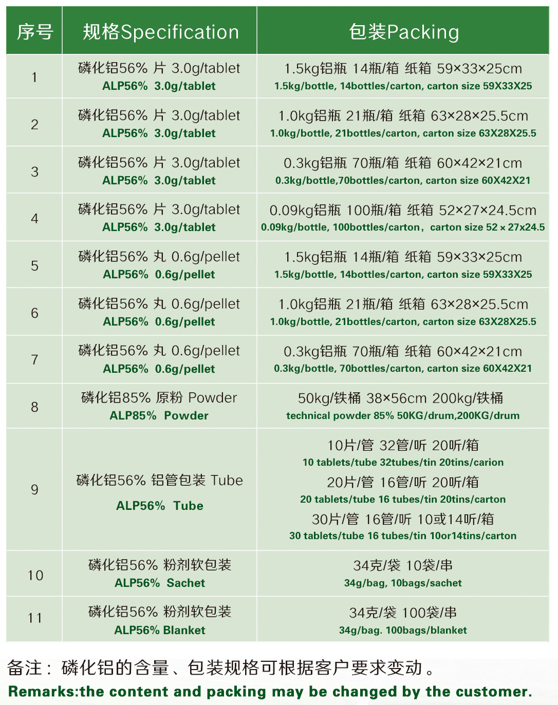 本品是由磷化铝、氨基甲酸铵及其它辅助材料制成的片剂/丸剂,磷化铝含量≥56%,片重/丸重为3.0±0.05克/0.6±0.03克。本品可用于熏杀粮食、种子、药材、烟草、竹器、皮毛、图书、干果等仓储害虫,也可用于森林和果树杀虫等。